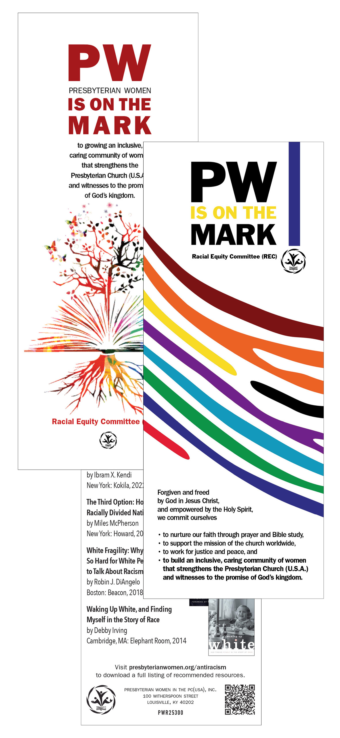 “PW IS ON THE MARK” to building an inclusive, caring community of women that strengthens the Presbyterian Church (U.S.A.) and witnesses to the promise of God’s kingdom. This newly designed FREE bookmark, that comes in two designs, lists racial equity resources recommended by PW’s Racial Equity Committee (REC). While supplies last!